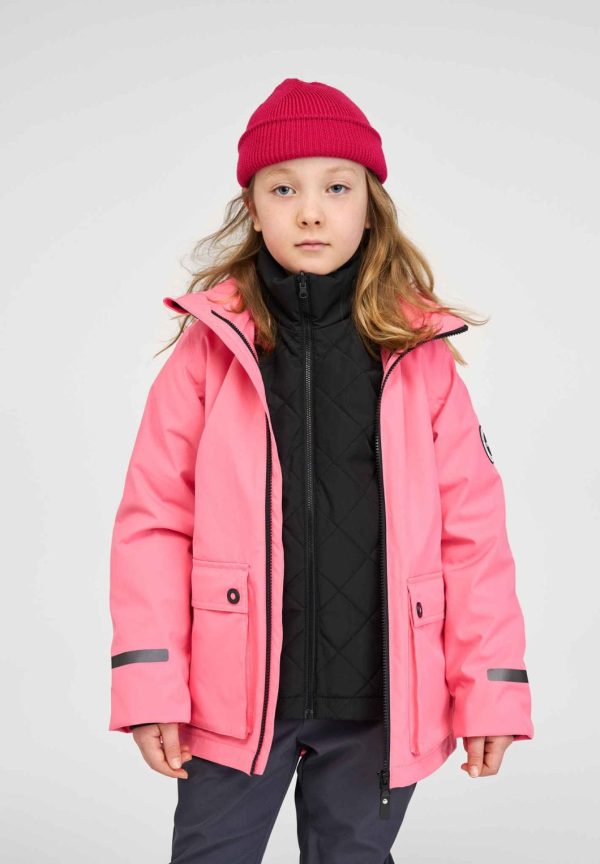This kids’ jacket takes influence from Reima’s design of the 1970s. The children’s 3-in-1 jacket comes with a light, detachable, quilted inner. All seams of the shell jacket are sealed waterproof, and the material is highly dirt- and water-repellent. The hood is safe – attached with snap buttons, it comes off easily if caught on something. The jacket’s adjustable hemline keeps the wind out, and two flap pockets and big reflective details finish off the retro look!